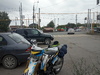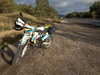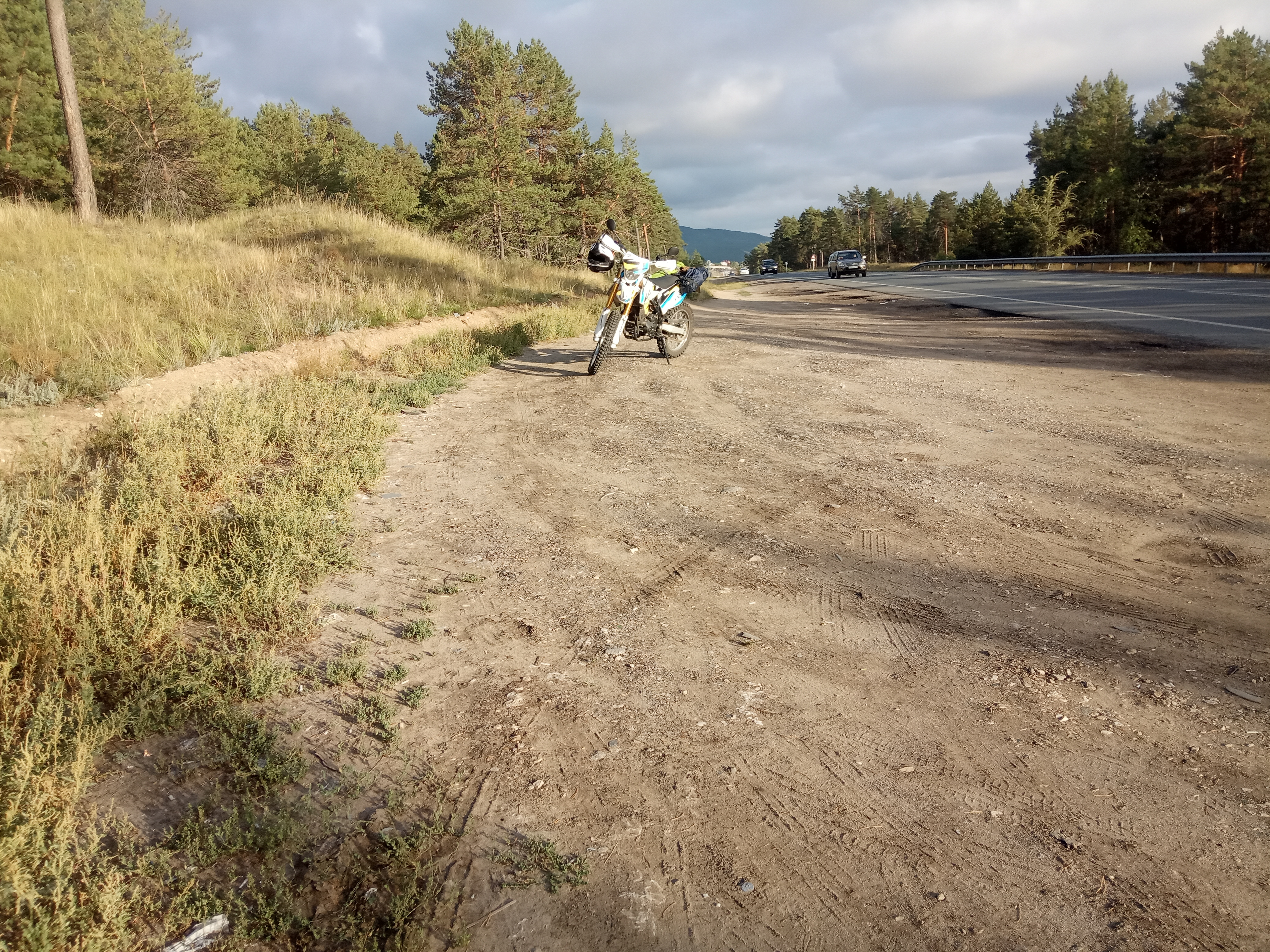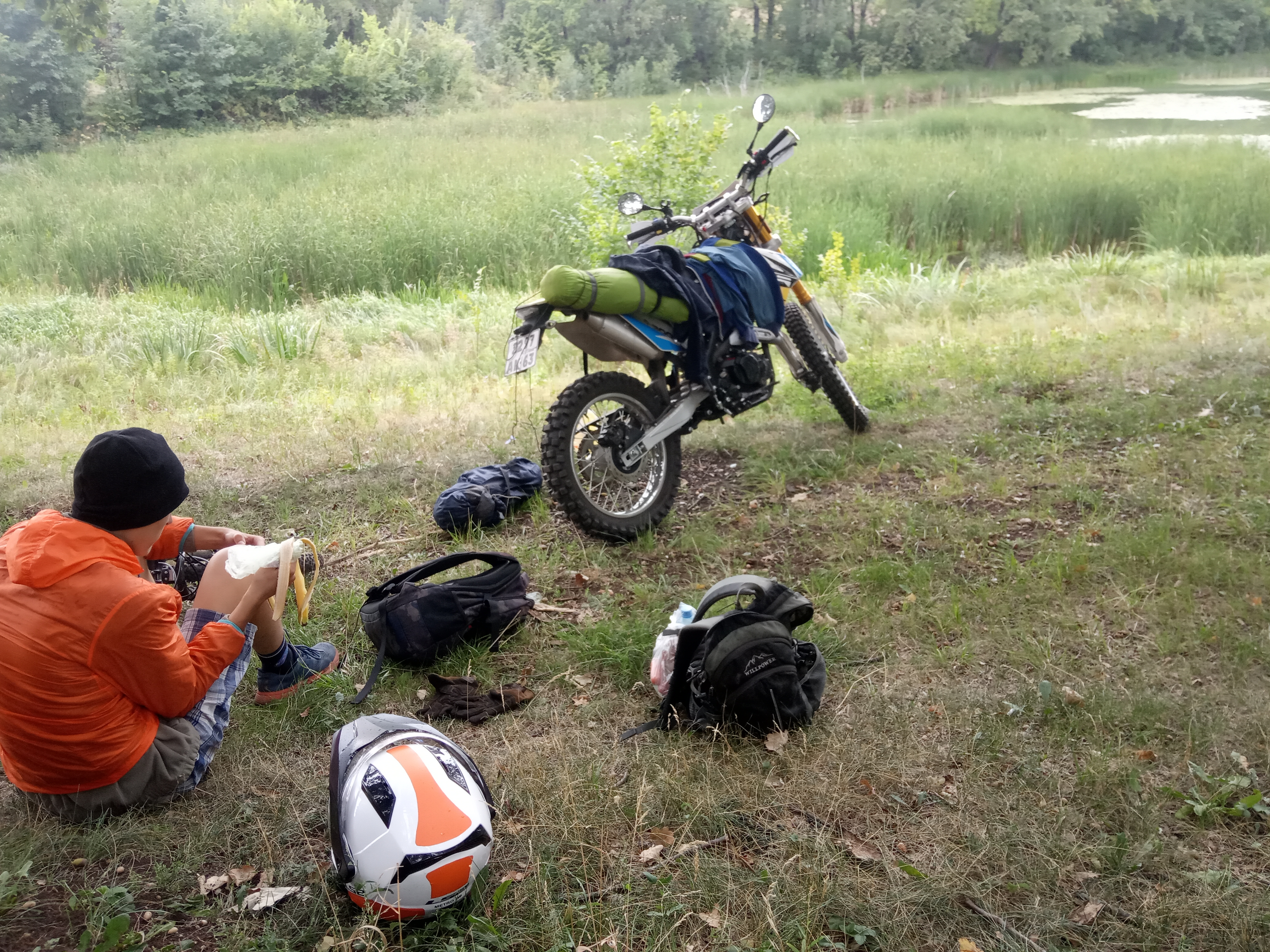 - Долго привязывал вещи к заднему крылу мотоцикла. Багажника там нет. Сделал на скорую руку стяжной ремень на фастексах. Плюс верёвочками примотал. Да, со стороны глушителя палатка нависала близко, подложил фанерку, чтобы материя не прогорела (говорят, что распространенный случай).